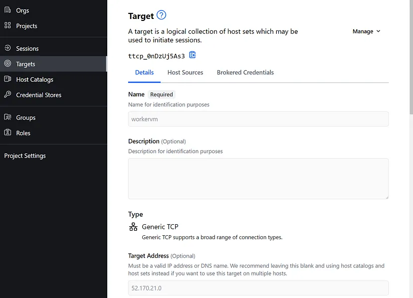 Once auth is done , go back to the admin gui and add the target, which in our case is the VM in HUB with public IP. I have my Worker machine as an Ubuntu machine so TCP port 22.I have named it worker vm. Heads up before we move on , below is the config we are attempting.
